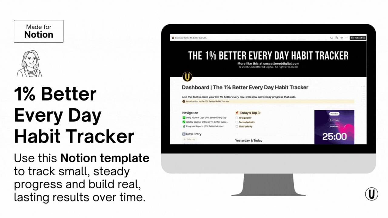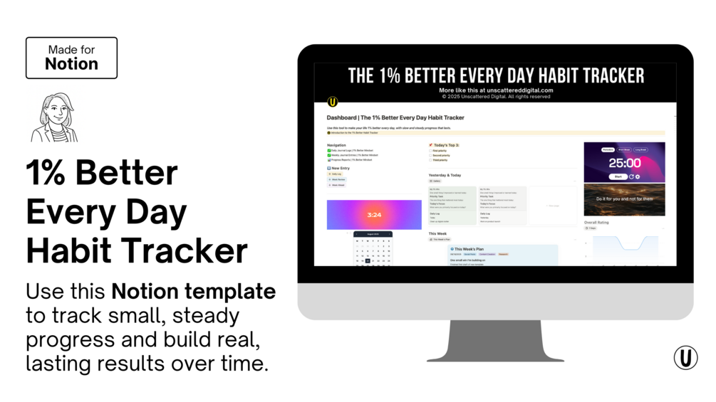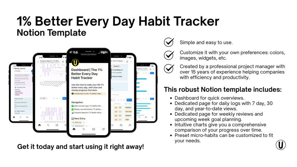 You’ll get a Notion-based tracker with a daily log to capture micro-habits, weekly views to spot patterns, and simple charts to visualize your growth. Fully customizable so it fits your goals and routine.