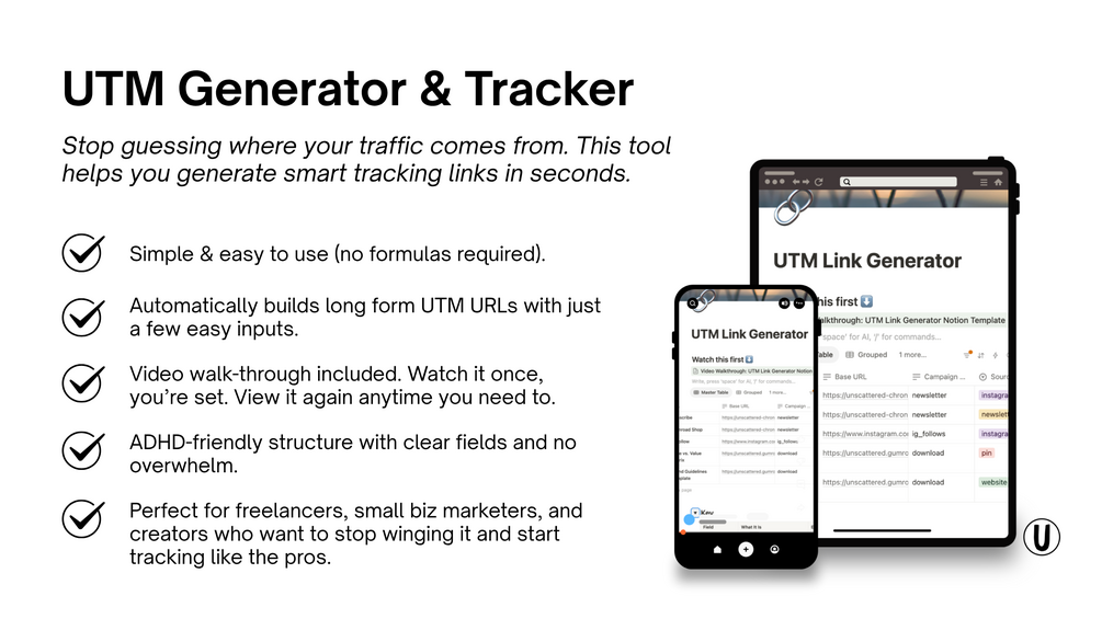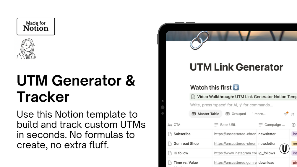 That’s where UTMs come in, and where this ADHD-friendly Notion template saves your marketing day.